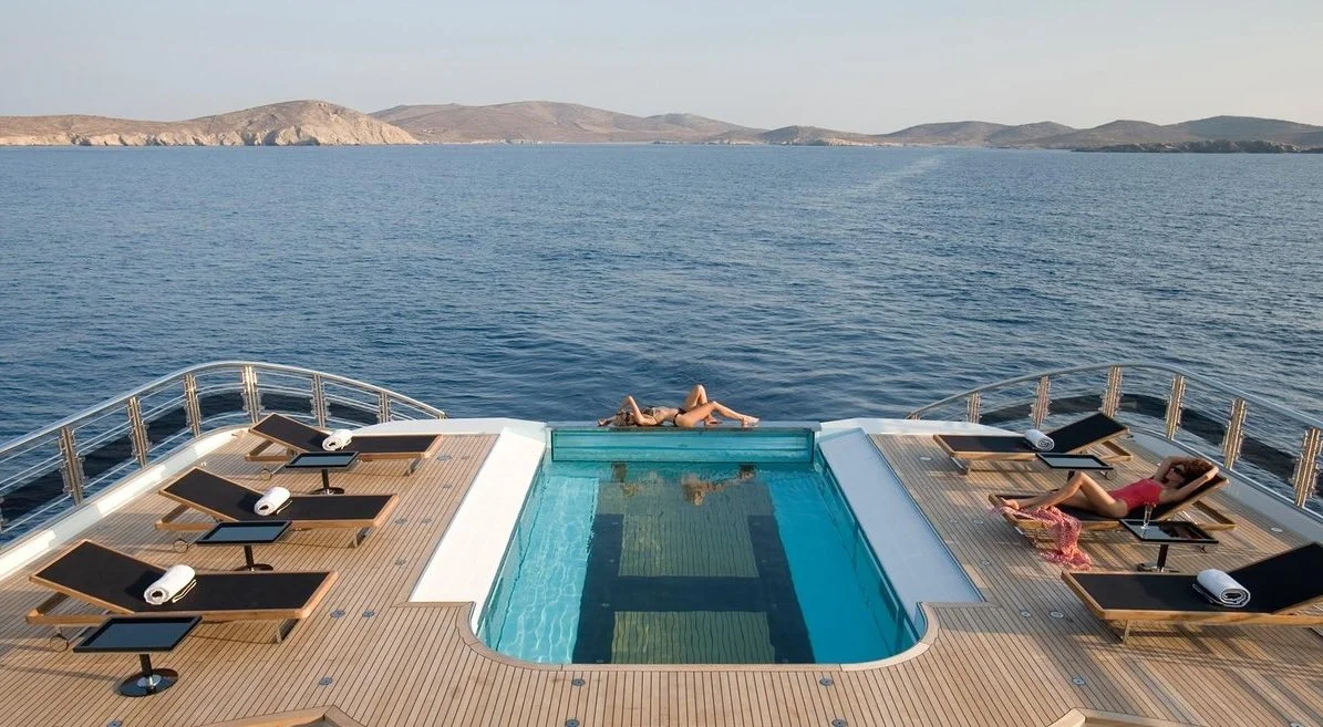 Adjustable depth pool systems on yachts maximize space and fun. Pool platforms allow you to have an entertainment deck, pool, sun platform, and hot tub in the same space.